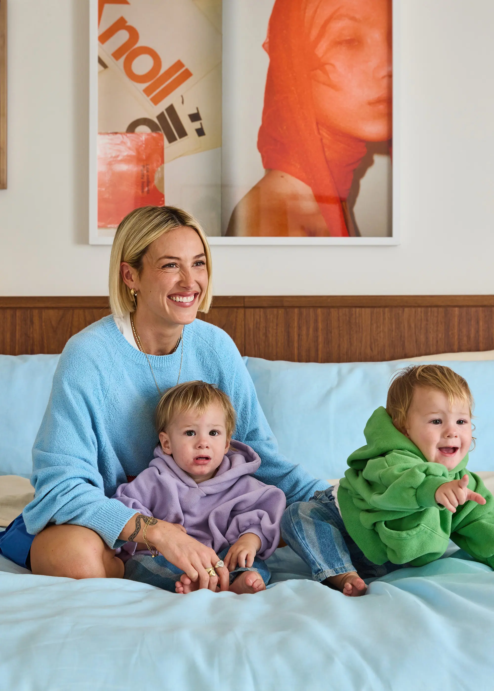 After years abroad, she was drawn to Byron Bay, a creative hub that speaks to both her fun-loving and familial sensibilities. Here, she floats between her artist studio and family home. The latter, a playful retreat shared with her husband Ty and twin boys – Ruby and Rome.