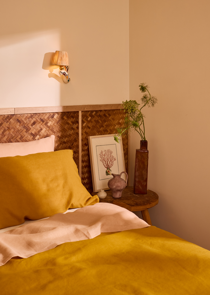 If you could do with more storage (and who couldn’t?), clever under-bed drawers allow for an extra stash of linens, clothing, or seasonal pieces. Bedheads with shelves and built-in side tables and sconces save space while looking effortlessly chic, as seen in both Bella and Olive’s homes. Size shelving to fit the things you’d like to display – your books, records, or keepsakes – so everything feels intentional and within reach.