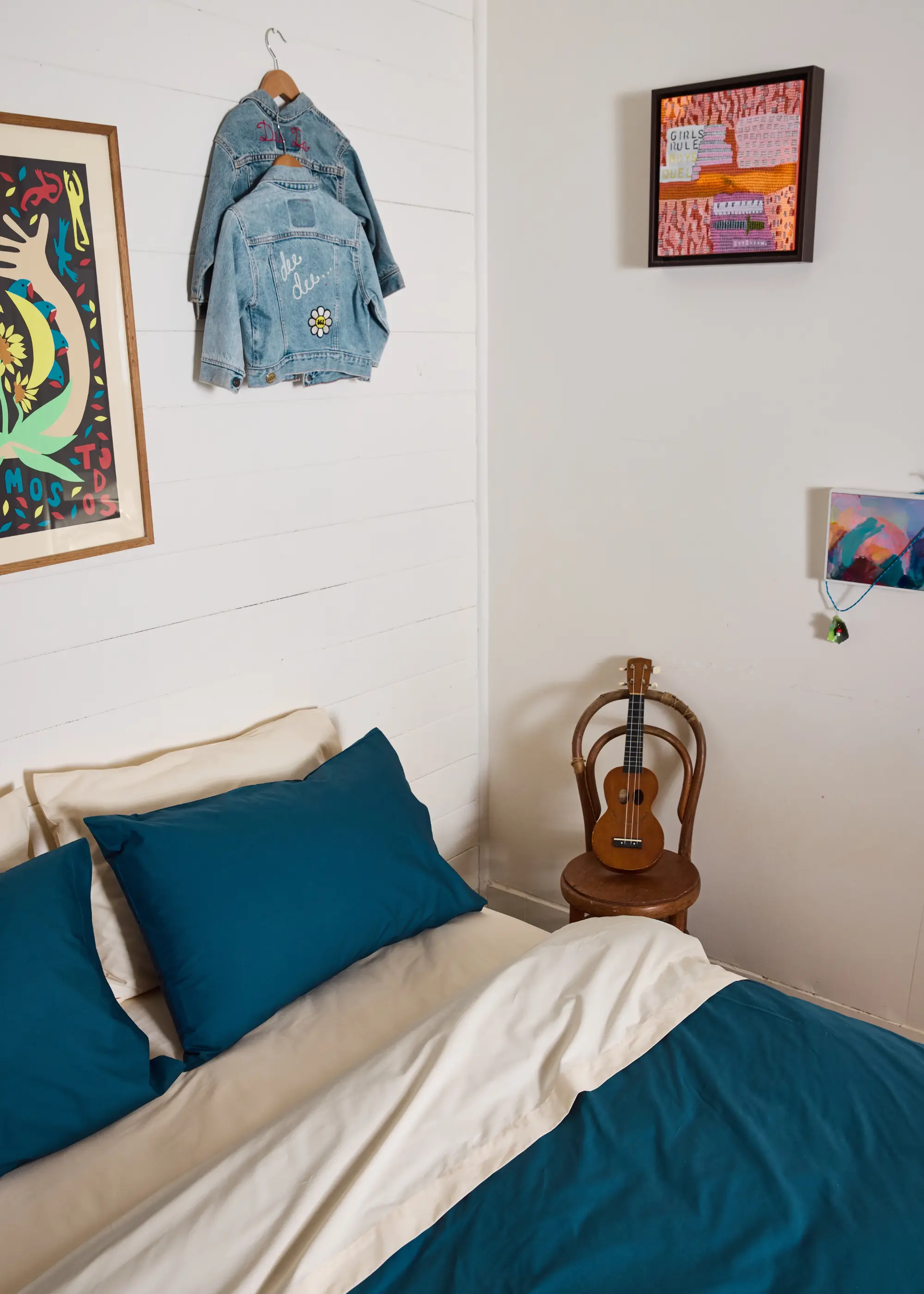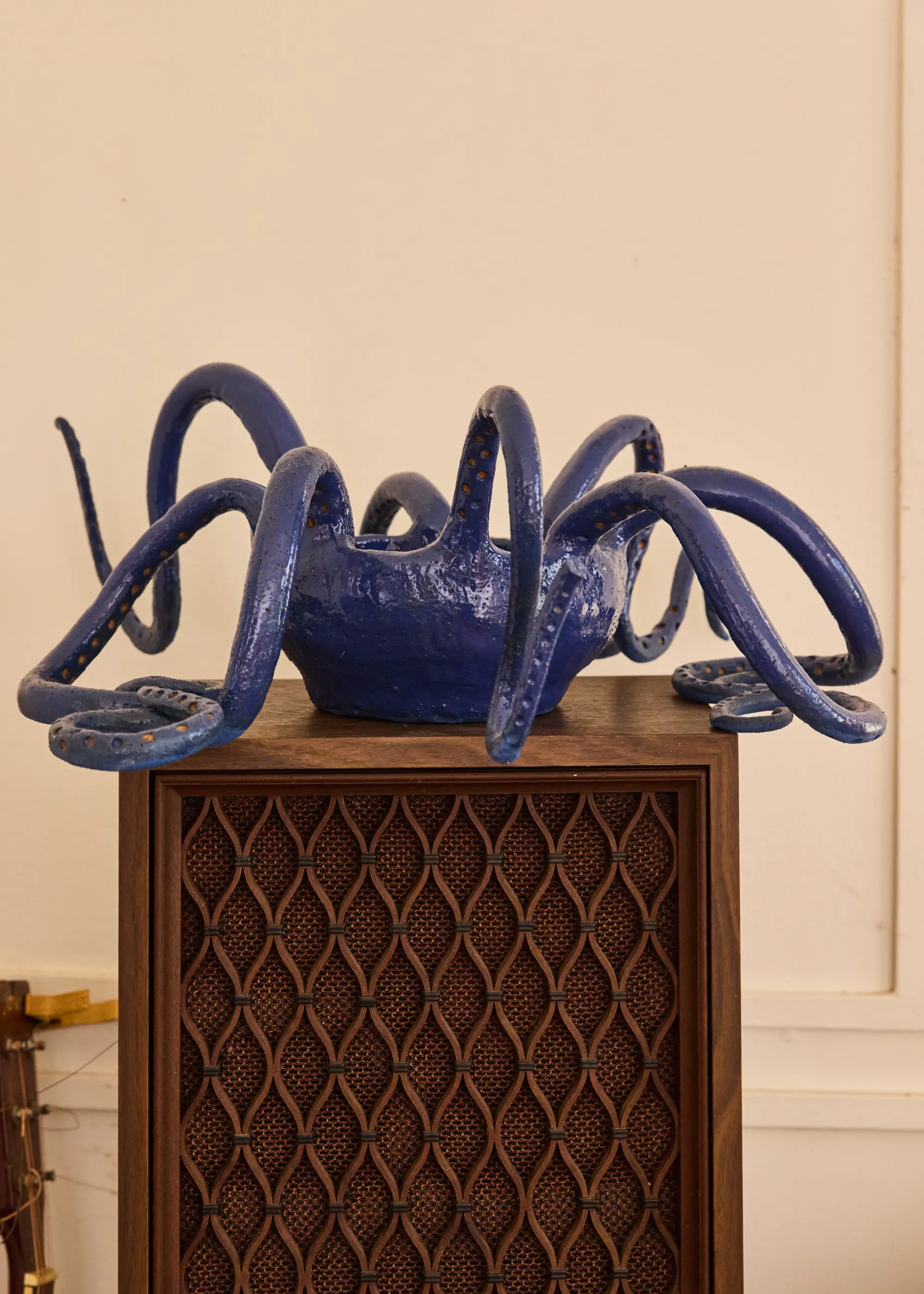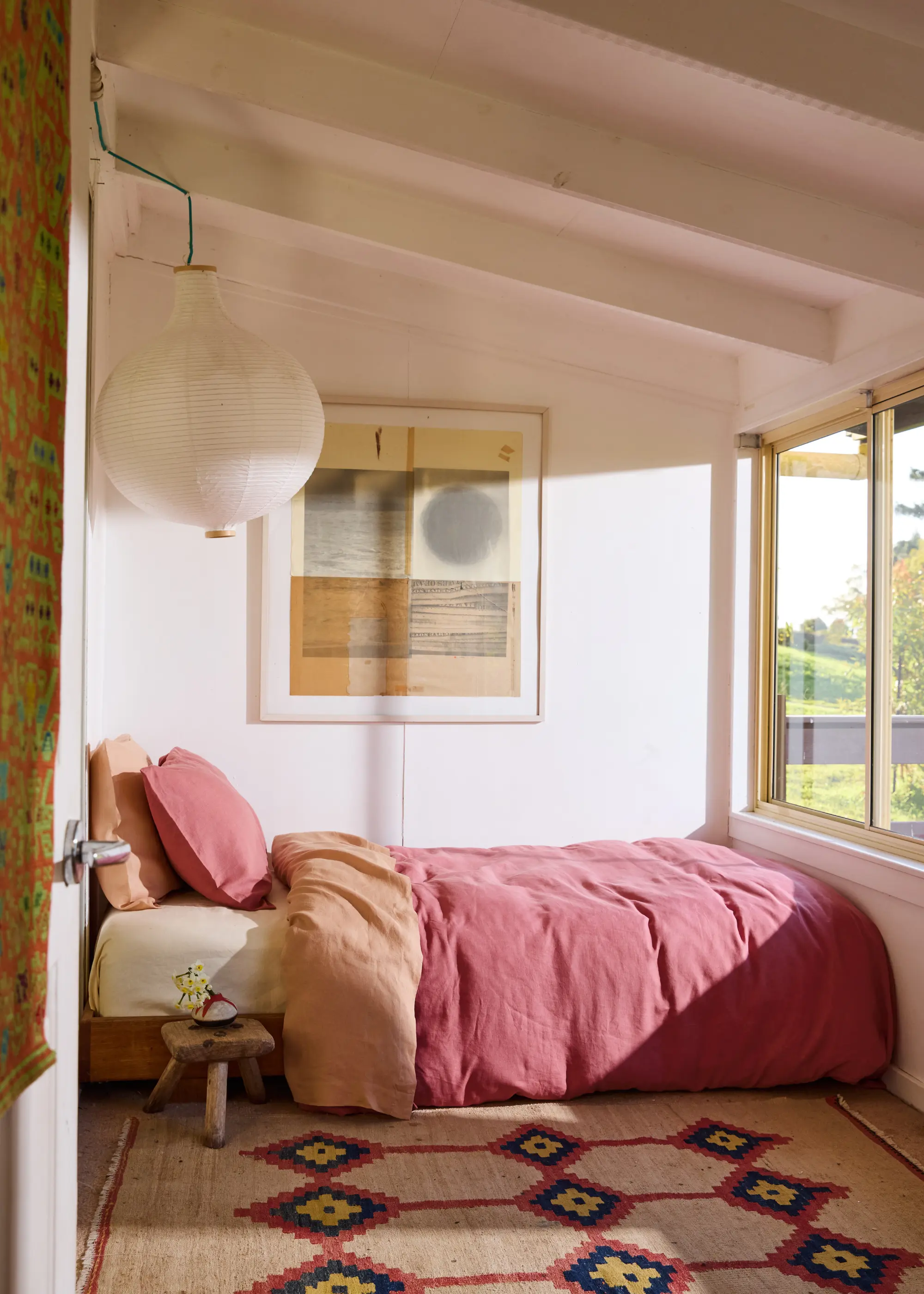 Another through-line between Julia’s work and home is her commitment to supporting fellow makers by commissioning and curating their work. “There's nothing that I enjoy more than encouraging and supporting someone who's creating,” says Julia. “And if I can use my work to do that, it really fills my cup.” For example, the red aluminium stools at previous hotel project The Sunseeker were crafted by friend and local designer Jack Fearon, brokered during a chance run-in at the pub. Over at Sun Ranch, the Argentinian rugs are by local brand Pampa, while the bespoke lamps are crafted by Lana Launay, who Julia met through long-time friend and collaborator Lucy Folk.