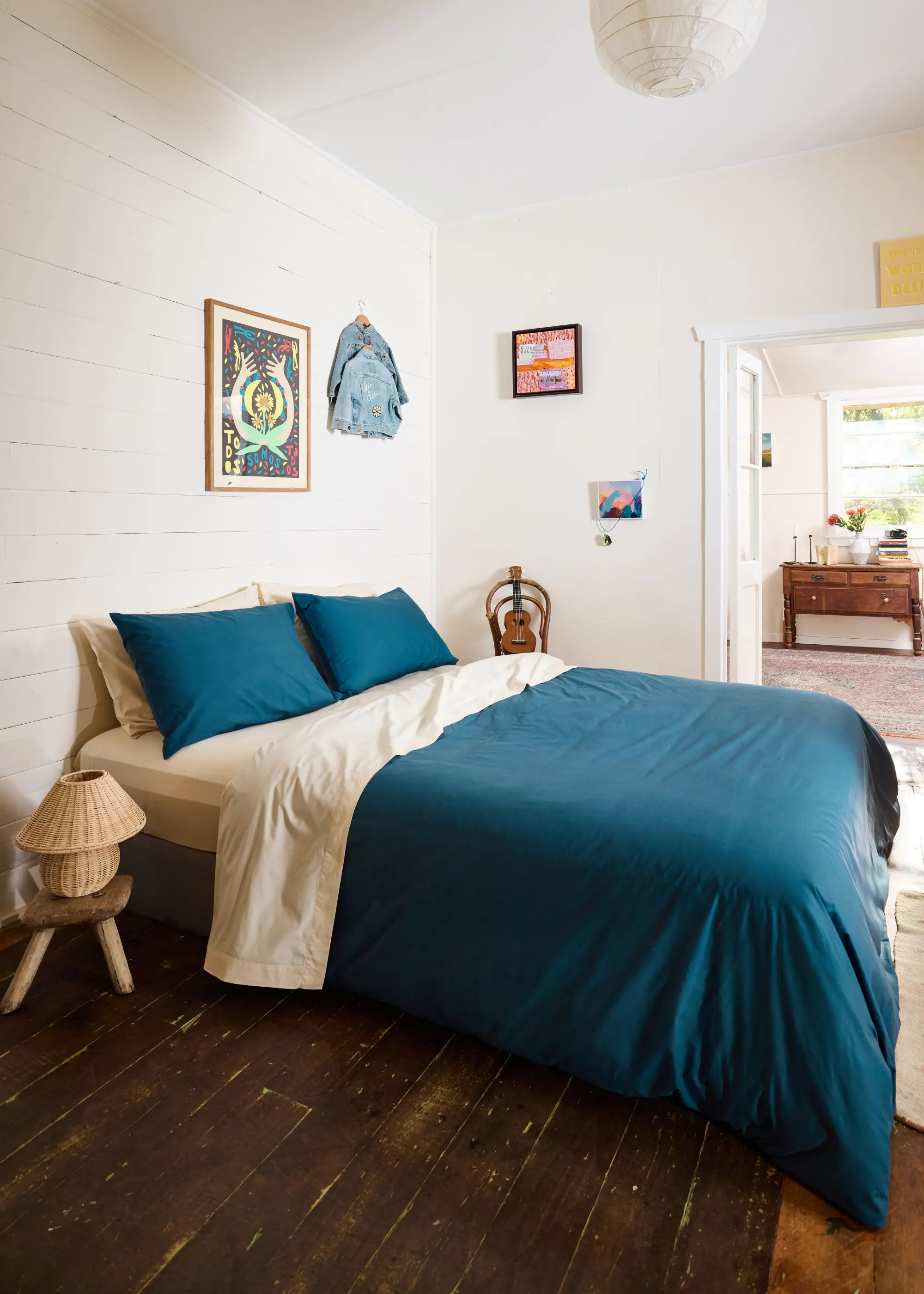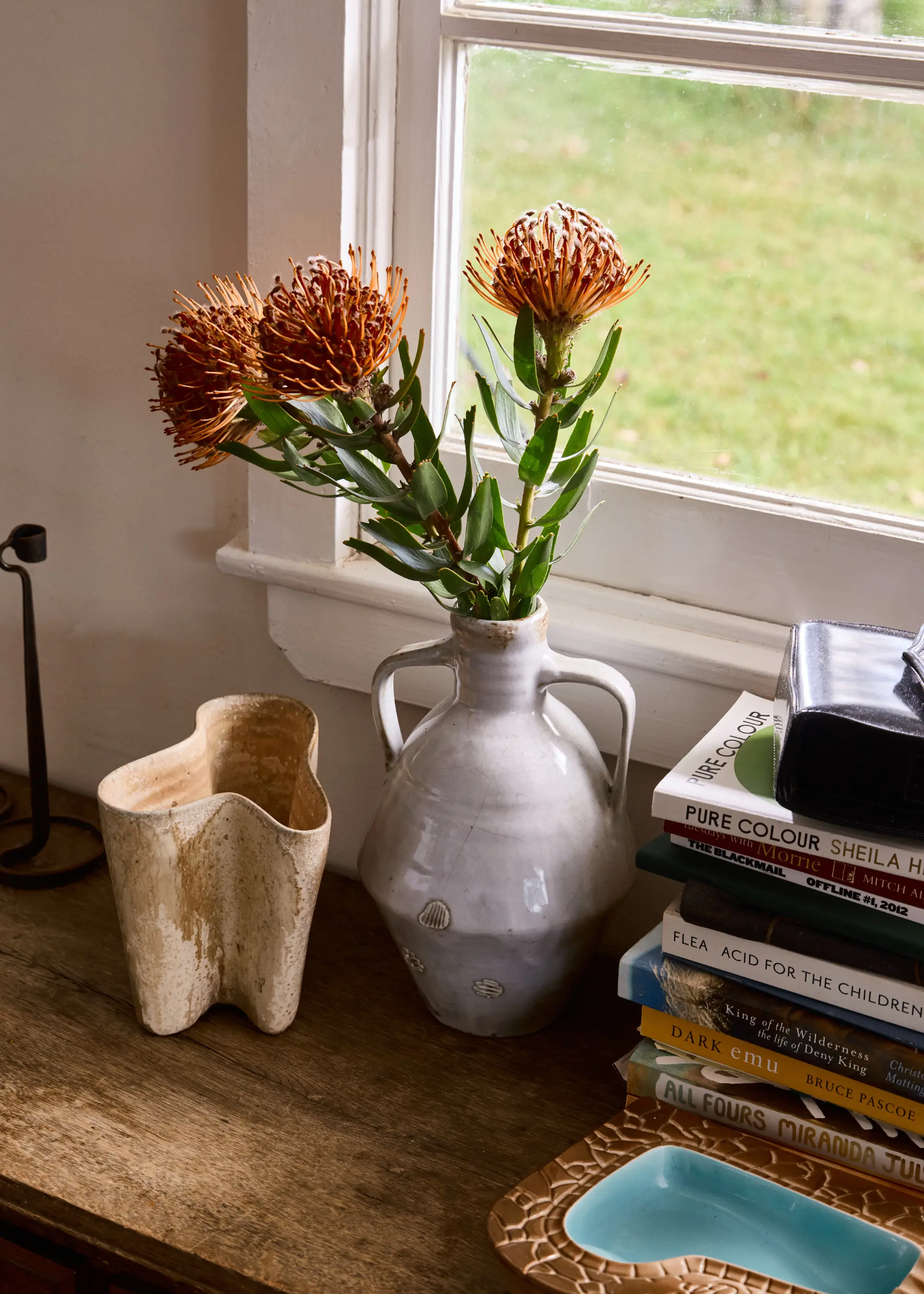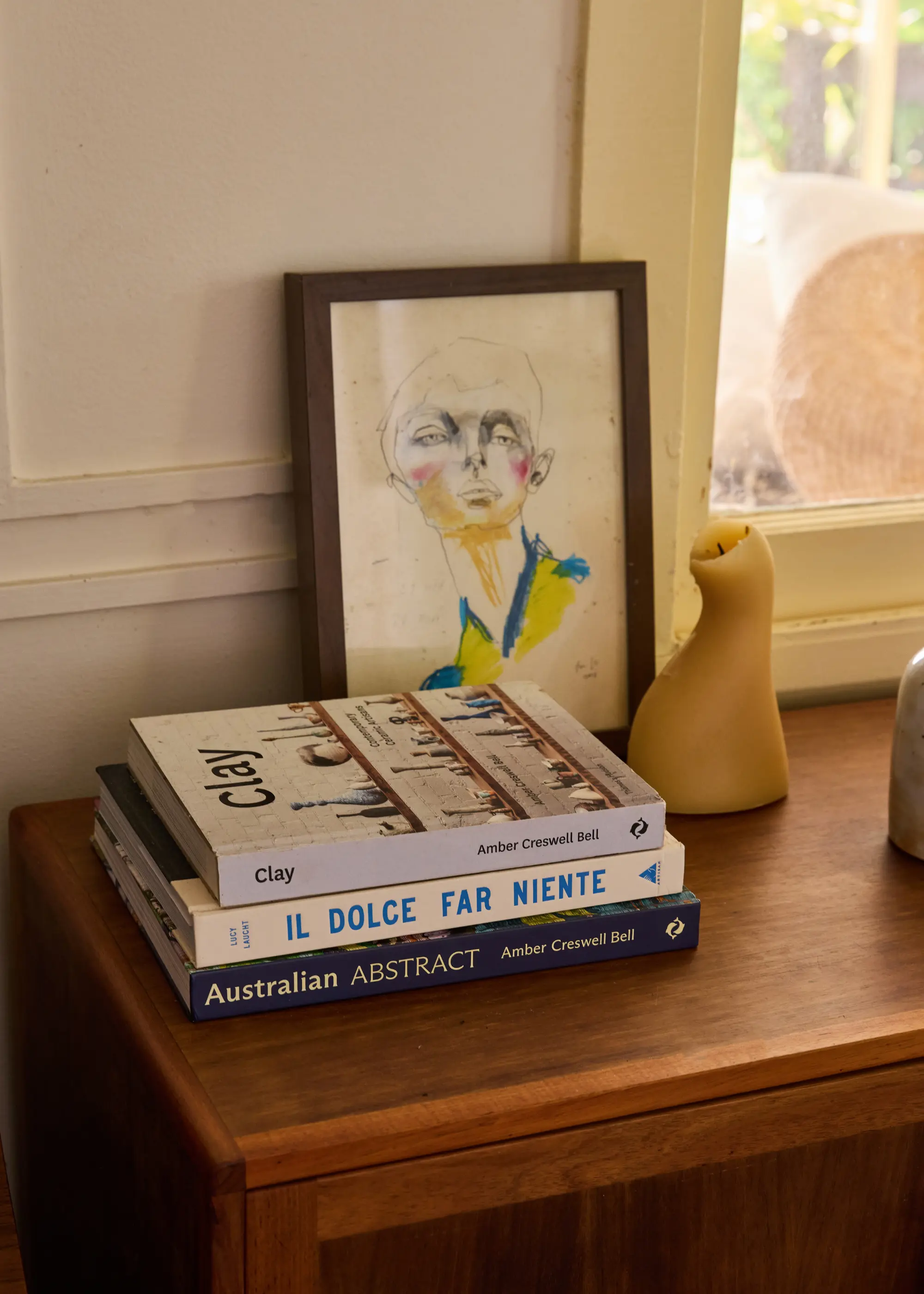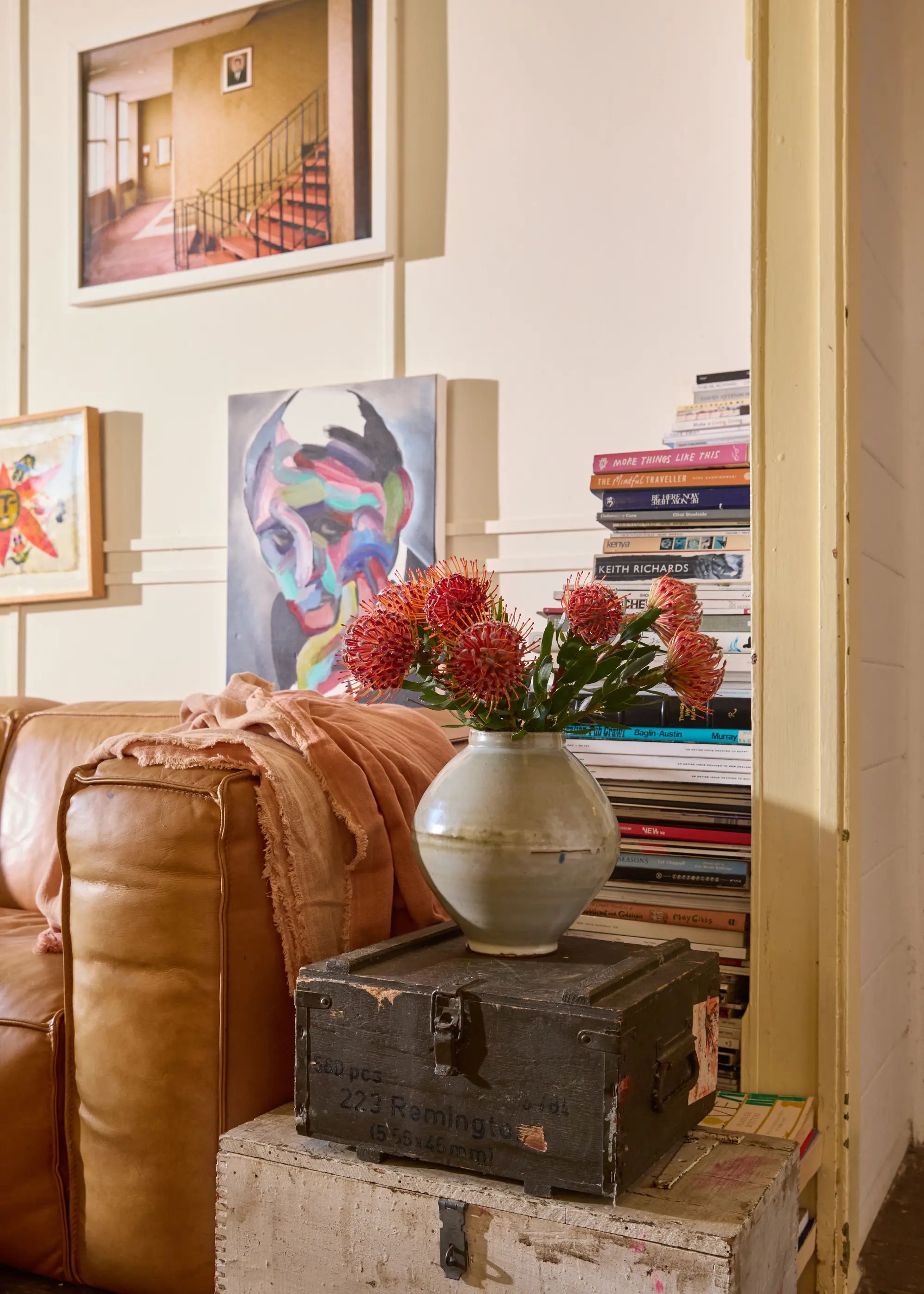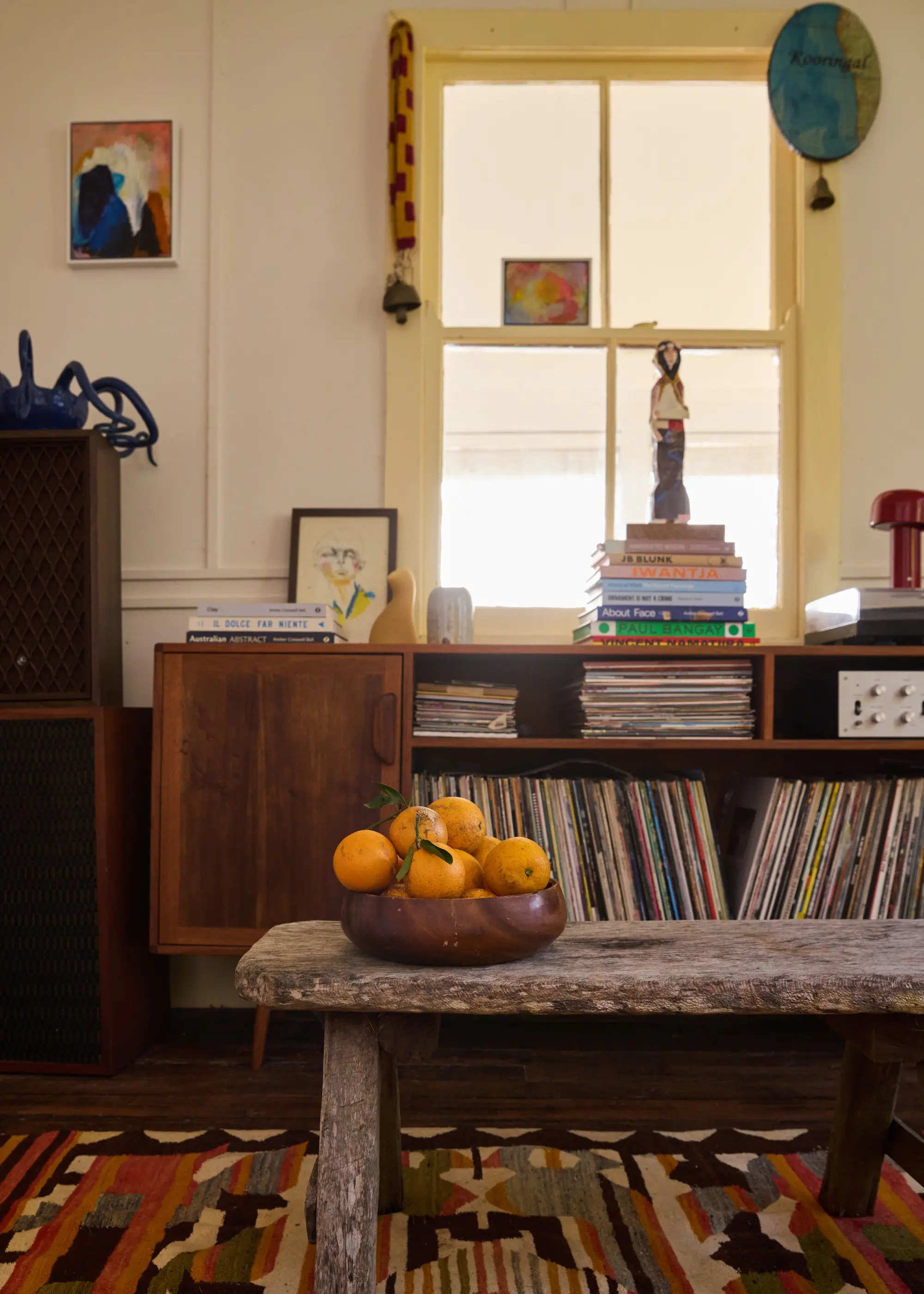 With Matt having once owned a gallery, there’s “art behind every door and under every bed,” as well as an ever-growing collection of works by friends and local artisans. Peppered throughout the rooms are paintings by Jedda Daisy Culley, vessels by Angus McDiarmid of Pãn Pottery, and Julia’s very own ceramic creations crafted alongside Alex from Muddy Clay. Layered among these are vintage objects and an enviable record collection that speak to the couple’s eclectic eye. Whether pre-loved collectable or handmade treasure, Julia most cherishes the story behind the object, “I want to know the origin of every piece. Where is it from, where has it been before?”