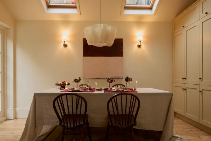 An unintentionally striking focal point is an artwork Dan painted on a whim, which hangs above the dining table. “He just bought a canvas one weekend, and was like, ‘oh, I just feel like doing a painting.’ Then I hung it up in the kitchen without his permission.” A guest visiting that week commented on how perfectly it suited the space, and it’s stayed put since. “He had never intended for that to be pride of place above the kitchen dining table, but it just works!”